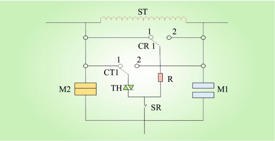文獻(xiàn)[12]介紹了一種組合式分接開關(guān),主要由TADS型切換開關(guān)和選擇器組成,切換開關(guān)的觸頭系統(tǒng)由晶閘管和機械觸頭組成,晶閘管作為切換開關(guān)的開關(guān)元件承擔(dān)電弧觸頭功能,負(fù)責(zé)開斷切換過程中的電流。TADS型切換開關(guān)原理如圖6所示,其中ST為變壓器高壓繞組線圈,CR1為過渡電阻回路選擇器,R為過渡電阻,CT1為晶閘管回路選擇器,TH為晶閘管,SR為固態(tài)繼電器,M1與M2為機械觸點。