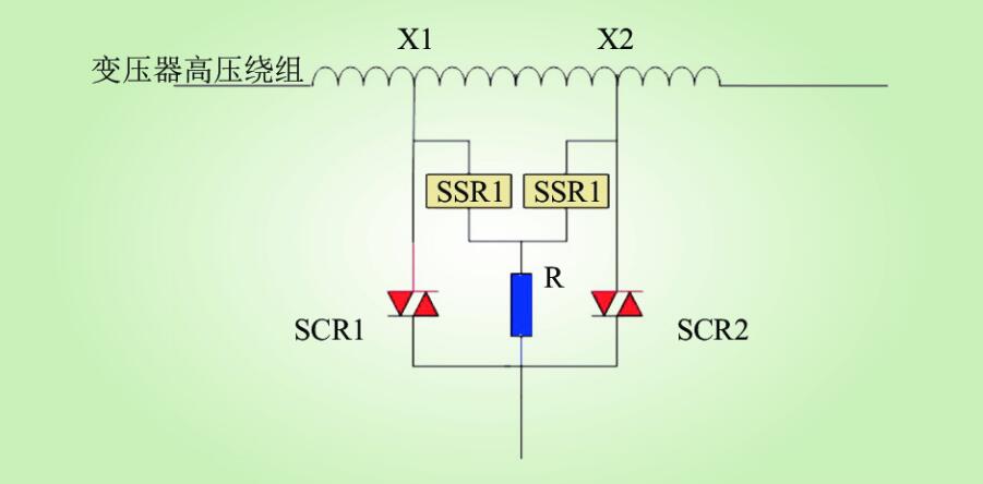 圖7中的X1和X2為有載調(diào)壓型配電變壓器的高壓繞組的2個抽頭;SCR1和SCR2為無觸點電力電子開關(guān)雙向晶閘管,SSR1和SSR2R為固態(tài)繼電器,R是起限流作用的過渡電阻。假定最初有載調(diào)壓型配電變壓器運行在繞組分接頭X2位置,雙向晶閘管SCR2則處于全導(dǎo)通狀態(tài),電流通路為X2-SCR2,SSR1、SSR2、SCR1均處于斷開狀態(tài)。當(dāng)需要將分接頭由X2調(diào)整到X1時,調(diào)整過程具體包括:先觸發(fā)導(dǎo)通固態(tài)繼電器SSR1,然后關(guān)斷SCR2,電流通路變?yōu)閄1-SSR1-R,再觸發(fā)導(dǎo)通SCR1,電流通路變?yōu)閄1-SCR1,這樣就完成了一次分接的轉(zhuǎn)換。與傳統(tǒng)機械式有載調(diào)壓開關(guān)相比,不存在任何的運動部件和電動操作機構(gòu),真正消除了原有的故障隱患,完全由軟件控制實現(xiàn)分接的選擇和快速切換。該方案還處于研究與完善階段。