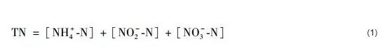 氨氮采用納氏試劑分光光度法;亞硝酸鹽采用N-1-萘基-乙二胺光度法;硝酸鹽采用紫外分光光度法[16];VSS采用重量法測定;pH值的測定采用玻璃電極法.總氮采用式(1)進行計算: