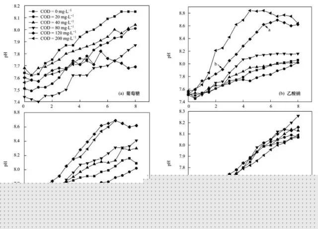 圖 9 不同有機物作用下厭氧氨氧化系統pH值的變化曲線