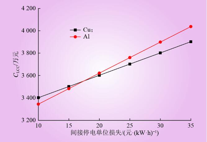 (3)在案例中選取一些因素進行靈敏度分析,發(fā)現(xiàn)間接停電單位損失和折現(xiàn)率對銅、鋁芯電纜LCC的影響較大,其中較低的間接停電單位電量損失和更高折現(xiàn)率會使鋁芯電纜更有優(yōu)勢。