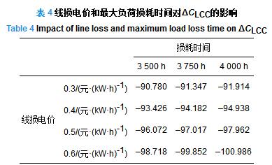 表 4 線損電價和最大負荷損耗時間對ΔCLCC的影響