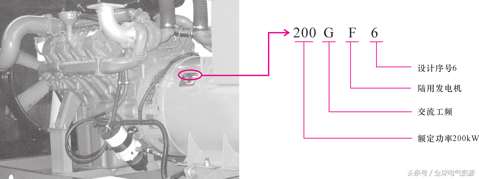 例如,圖7所示典型的發(fā)電機的銘牌顯示表示其型號為" 200GF6",能夠參照上述命名方法來理解該型號顯示的意思
