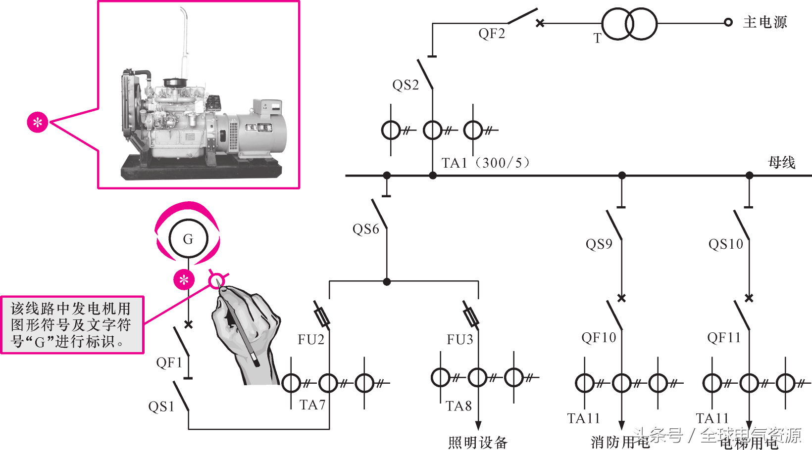 由此可知,發(fā)電機的符號與電動機的符號相似,一般用“g”字母表示。 g是發(fā)電機,GD是DC發(fā)電機,GA是交流發(fā)電機(異步發(fā)電機),GS是同步發(fā)電機,GH是永磁發(fā)電機。 通過這些不同的字母表記號,可以快速識別線路中使用的發(fā)電機的類型。